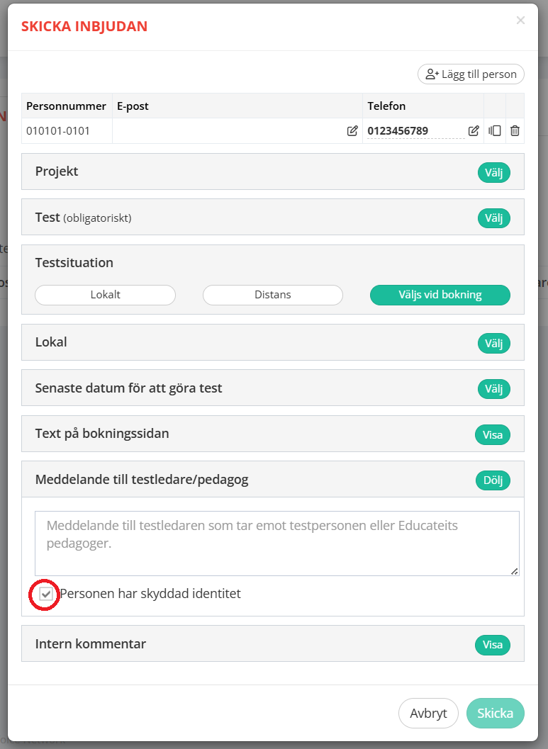 Vid inbjudan är det viktigt att ni väljer "Meddelande till testledare/pedagog" och klickar i rutan "Skyddad identitet". Detta gör att vår personal som tar emot vid distanstest, kan ordna en egen testledare för personen om hen vill det. Det innebär också att bedömningen av testet kommer att prioriteras för att vi så snabbt som möjligt ska kunna gallra bort personuppgifterna från systemet.