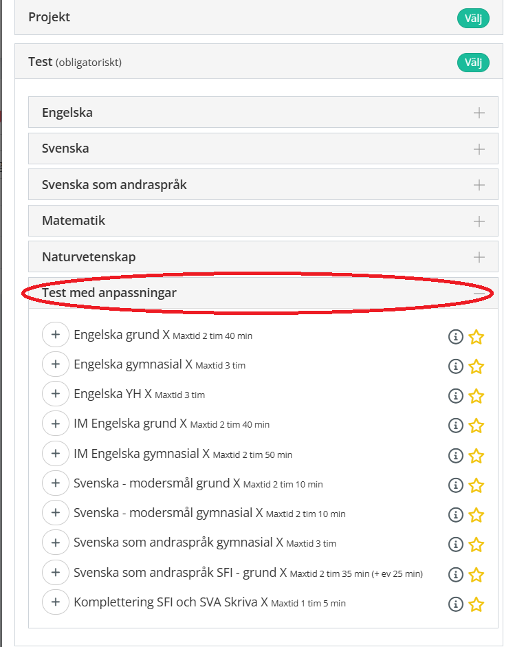 Test med anpassningar ligger samlade under "Test med anpassningar" när man bokar ett test/skickar en inbjudan till test.