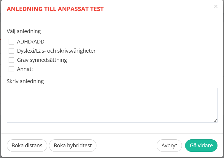 När man bokar/lägger upp ett anpassat test ombeds man ange orsak till att personen skall göra det testet eftersom vi tar hänsyn till eventuell dyslexi när vi bedömer skriften och lämnar vår rekommendation om startnivå.