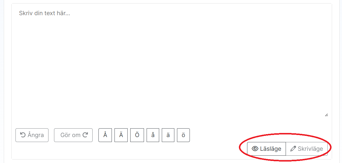 Det går även att få den text som testtagaren själv skriver uppläst. För att få texten uppläst, behöver man först trycka på "örat" för att få fram knapparna "Läsläge" och "Skrivläge". När man vill få texten uppläst väljer man Läsläge och när man vill skriva, väljer man "Skrivläge".